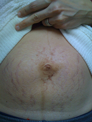 Enfin, comme je voulais vraiment savoir si le traitement marchait, il y a une vergeture que j’avais sur le sein après l’accouchement, elle était violette, mais assez courte et ne me dérangeait pas en regard du ravage sur le ventre. J’ai décidé de ne pas la traiter ce qui me permettait de voir la différence avec les vergetures du ventre (mes excuses pour mon esprit sceptique).